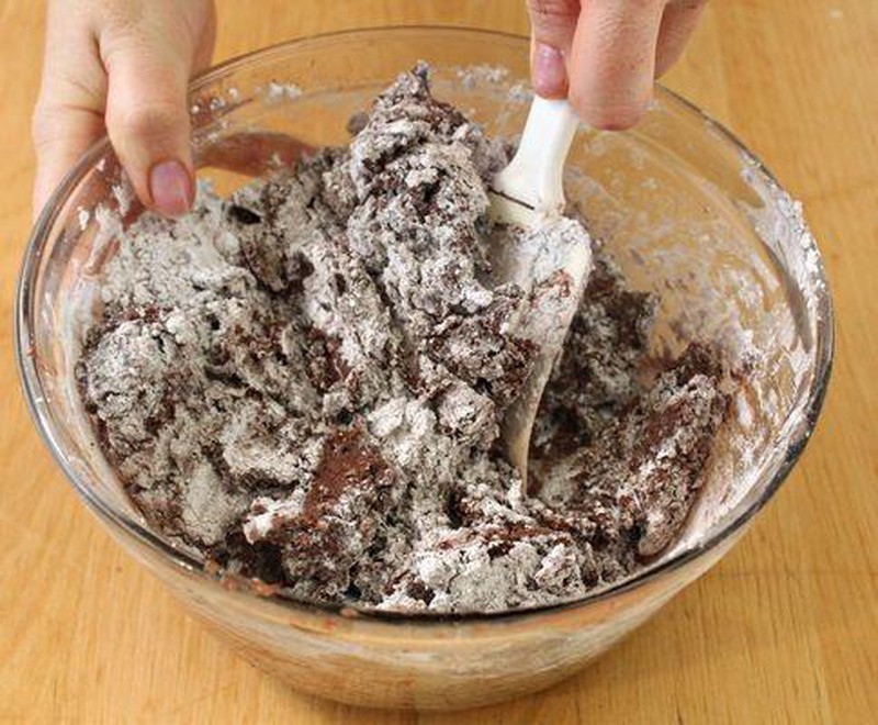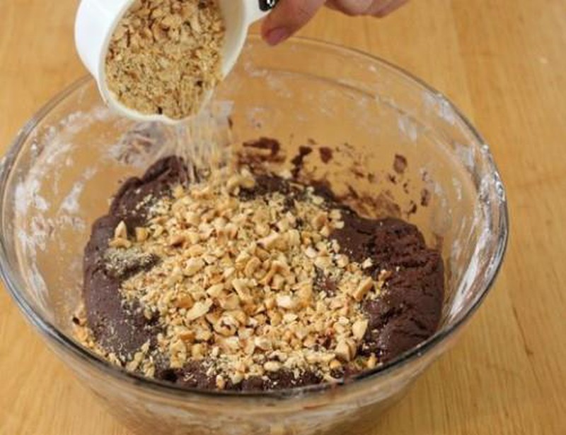 Bước 2:Trong một bát lớn, trộn đều sôcôla và nutella. Thêm bột cacao và bột đường vào rồi khuấy đều cho tất cả hòa quyện. Hỗn hợp này sẽ khá cứng nên bạn có thể nhào bằng tay hoặc dùng máy trộn đứng nhé. Cho hạt dẻ băm vụn vào rồi nhào thêm. |