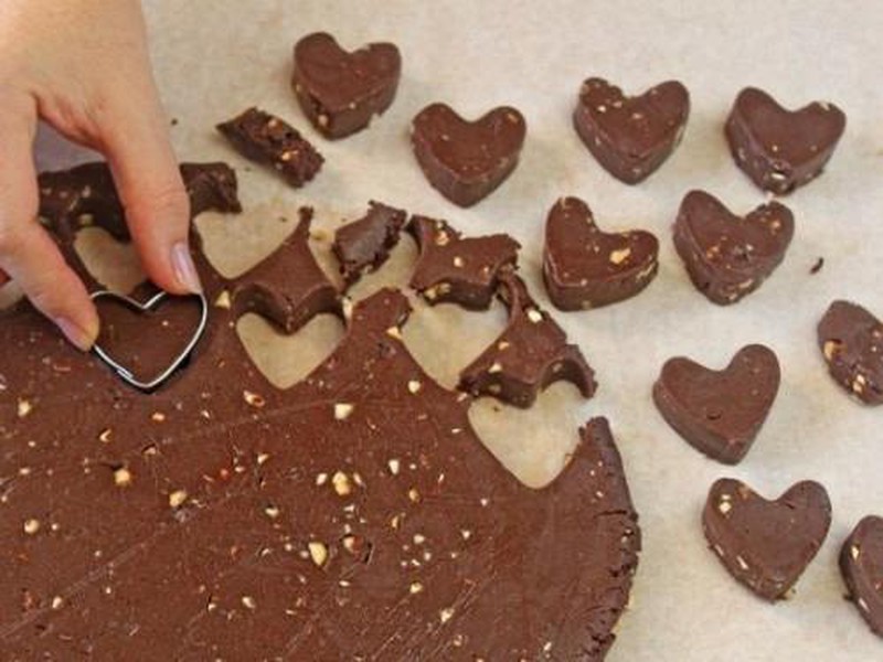 Bước 4: Sau đó, bạn lấy sôcôla ra, dùng khuôn trái tim để cắt sôcôla thành các hình trái tim nhỏ. sôcôla dư bạn lại nhào, cán mỏng rồi dùng khuôn trái tim cắt tiếp. Cứ làm như vậy, bạn sẽ được khoảng 70 hình trái tim. |