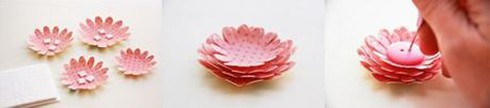 Bước 3: Tiếp đến, bạn dán các mẩu xốp dính nhỏ lên mặt 3 bông hoa lớn hơn. Sau đó dán chồng các bông hoa theo kích cỡ từ lớn đến bé.