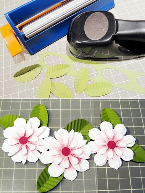 Tiếp tục làm lá bằng cách dùng giấy màu xanh, rồi dùng rập rập thành những chiếc lá với độ to nhỏ khác nhau. Và nếu không có dập bạn cũng có thể tự cắt chúng.