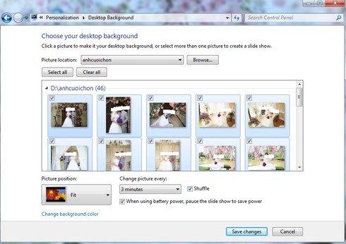 - Cửa sổ mới mở ra bạn bấm vào Browse để chọn thư mục chứa ảnh, sau đó bấm Ok để xác nhận. Tiếp đó, trong cửa sổ mở ra, bạn chọn thời gian thay đổi luân phiên các ảnh rồi click vào Save changes. Vậy là hình nền của bạn sẽ được tự động thay đổi.