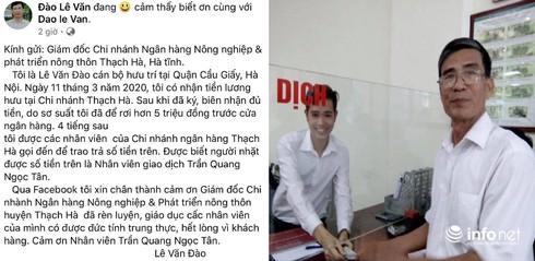 Cán bộ hưu trí lên facebook cảm ơn nhân viên ngân hàng trả lại của rơi