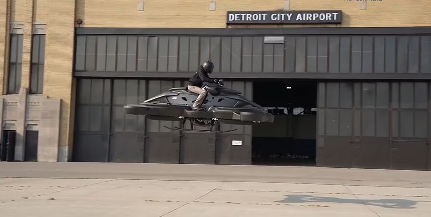 Hiện tại, chiếc xe máy biết bay có hai trục quay lớn ở giữa di chuyển nhờ động cơ môtô Kawasaki 228 mã lực.