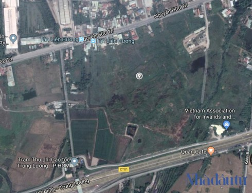 Lô đất 16,6ha của Thuận Thảo Nam Sài Gòn nằm trên mặt đường Nguyễn Hữu Trí. Góc trái trong ảnh là Trạm thu phí Cao tốc TP.HCM - Trung Lương. Ảnh: NĐ |