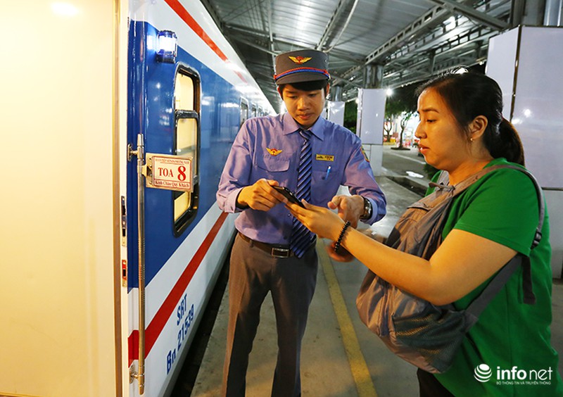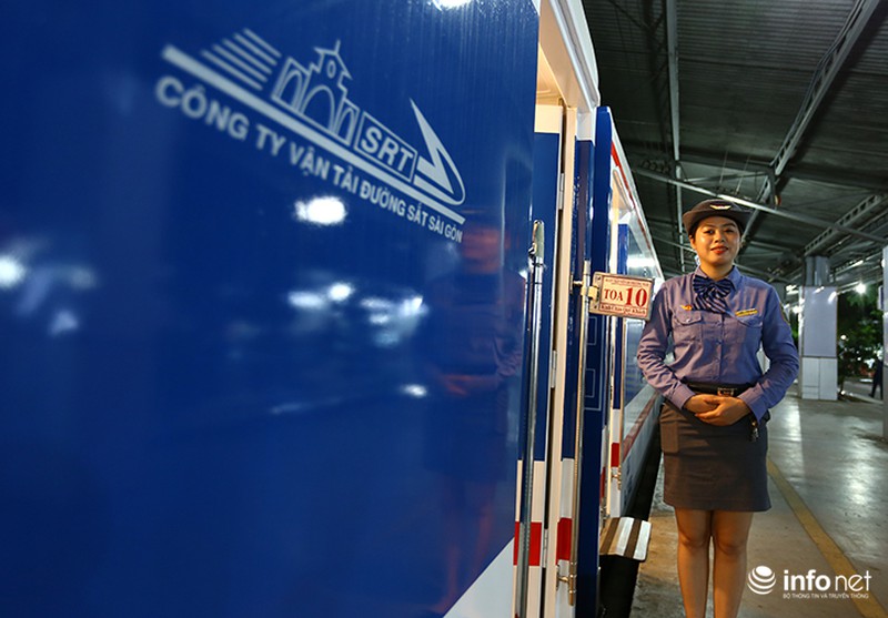 Anh Trần Khánh Tâm - Trưởng tàu SE4 cho biết: "Đoàn tiếp viên Đường sắt Phương Nam phục vụ trên tàu SE4 đều đã được tuyển chọn kỹ lưỡng, hầu hết đều có kinh nghiệm và thông thạo ngoại ngữ để phục vụ tốt cả hành khách nước ngoài". |
