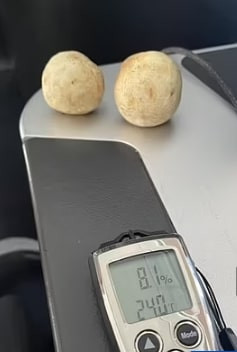 Sau 3 giờ bay, độ ẩm môi trường giảm xuống 8%, nấm bắt đầu co lại và mất nước. Khi máy bay hạ cánh xuống sân bay quốc tế Chicago O'Hare, 8 giờ sau khi cất cánh, những cây nấm bị thu nhỏ kích thước, có nếp nhăn sâu, vỏ cứng lại.