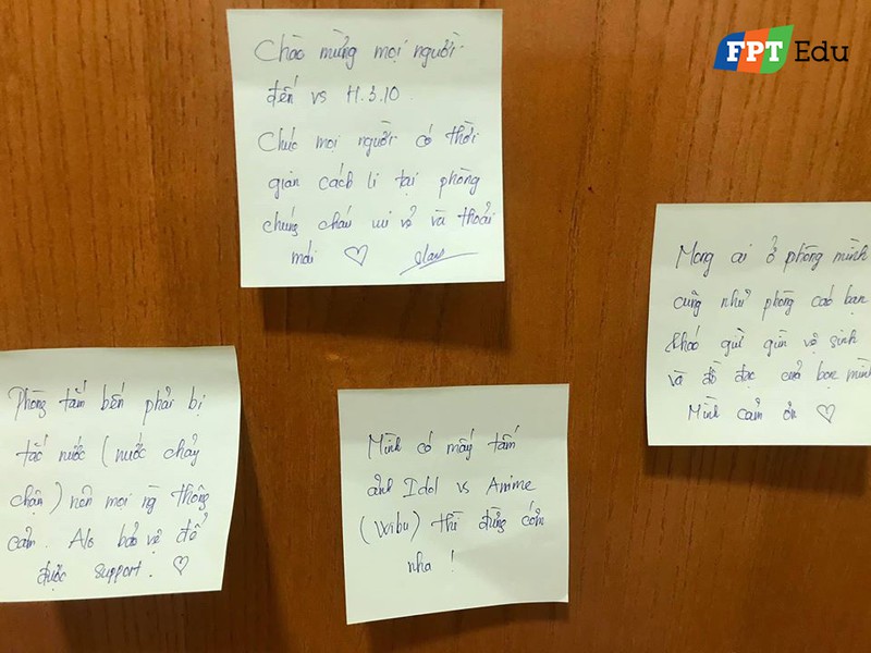 Nhiều bạn còn để lại những dòng thư chào mừng viết vội và những lời chúc hết sức đáng yêu dành cho các vị khách được cách ly tại trường.