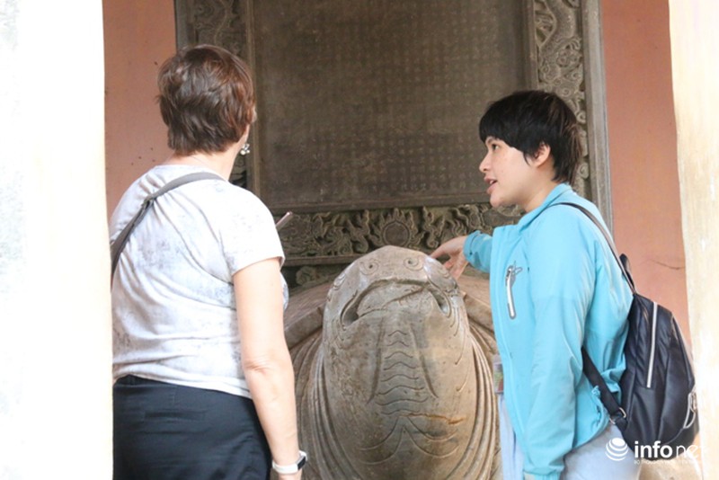Không chỉ chụp ảnh, khách nước ngoài còn được hướng dẫn viên giới thiệu về bia "Ngự kiến Thiên Mụ tự". |