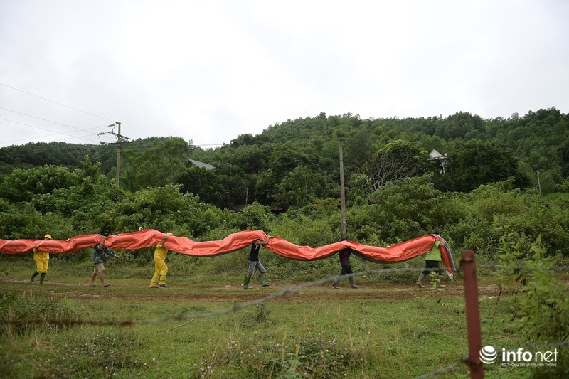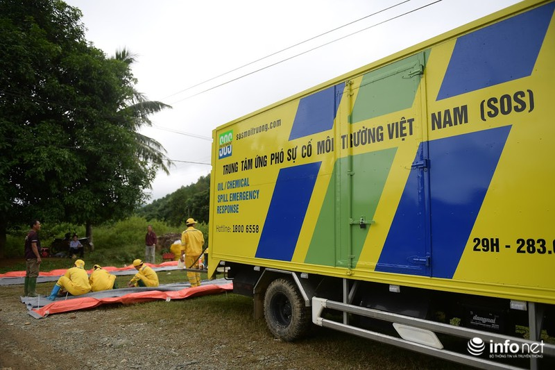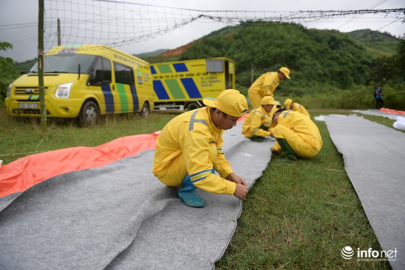 Quá trình xử lý ô nhiễm được các chuyên gia của Trung tâm Ứng phó sự cố môi trường Việt Nam (SOS) thực hiện sau khi huy động phương tiện, trang thiết bị, vật tư chuyên dụng. Các tấm lọc chuyên dụng được lắp đặt dọc theo suối Trầm, suối Bằng dẫn về hồ Đầm Bài để tách dầu lẫn trong nước. |
