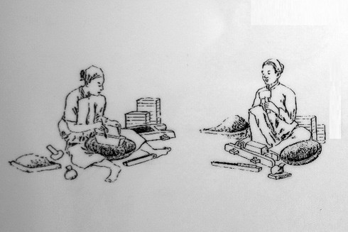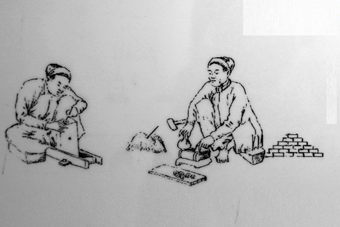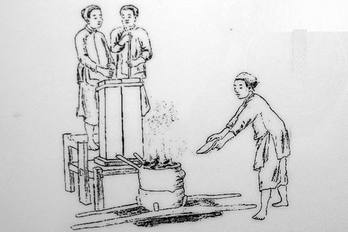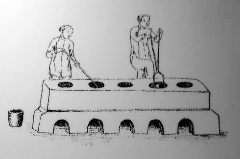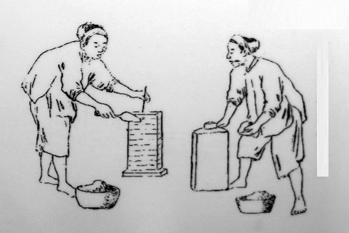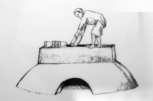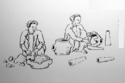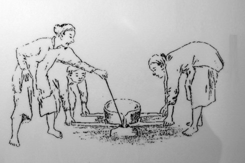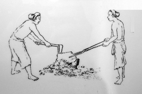 9-1. Dùng ống bễ thổi lửa nung nồi kim loại. Trộn đồng đỏ với than để tạo nhiệt độ cao. Khi đồng đỏ được nung nóng sẽ chảy xuống nồi phía dưới. |
