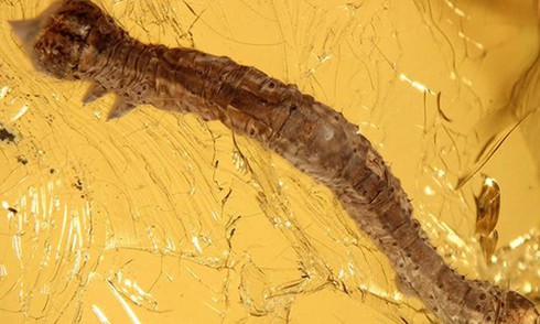 Các nhà nghiên cứu ở viện Bavarian State Collection of Zoology, Munich, Đức phát hiện xác con sâu bướm còn nguyên vẹn bên trong miếng hổ phách từ 44 triệu năm trước.