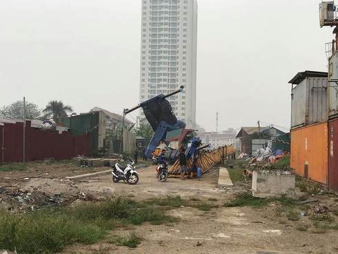 Khi đó, chiếc cần cẩu công trình bị đổ sập nằm trọn trong khuôn viên công trường, chiếc xe cẩu nằm ngay cạnh đó bị lật nghiêng, nhiều mảnh vụn tvương vãi khắp mặt đất.