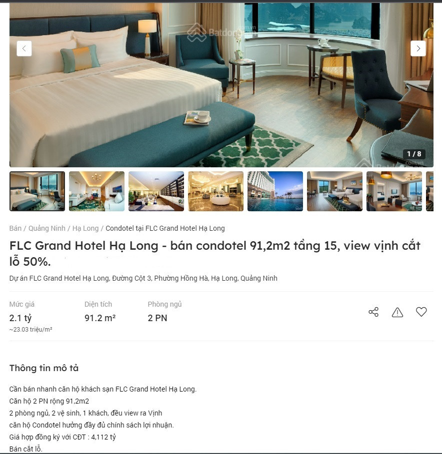 Chẳng hạn, căn condotel có diện tích hơn 91m2, 2 phòng ngủ ở dự án FLC Grand Hotel Hạ Long đang rao bán giá 2,1 tỷ đồng. Theo lời rao bán, mức giá này “cắt lỗ” 50% so với giá hợp đồng ký với chủ đầu tư là hơn 4,1 tỷ đồng.