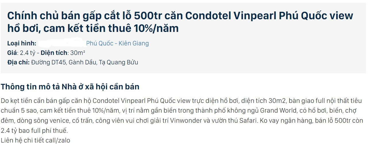 Chủ căn hộ condotel 30m2 ở Vinpearl Phú Quốc (Kiên Giang) rao bán “cắt lỗ” 500 triệu đồng. Theo đó, giá bán là 2,4 tỷ đồng, bao phí thuế.