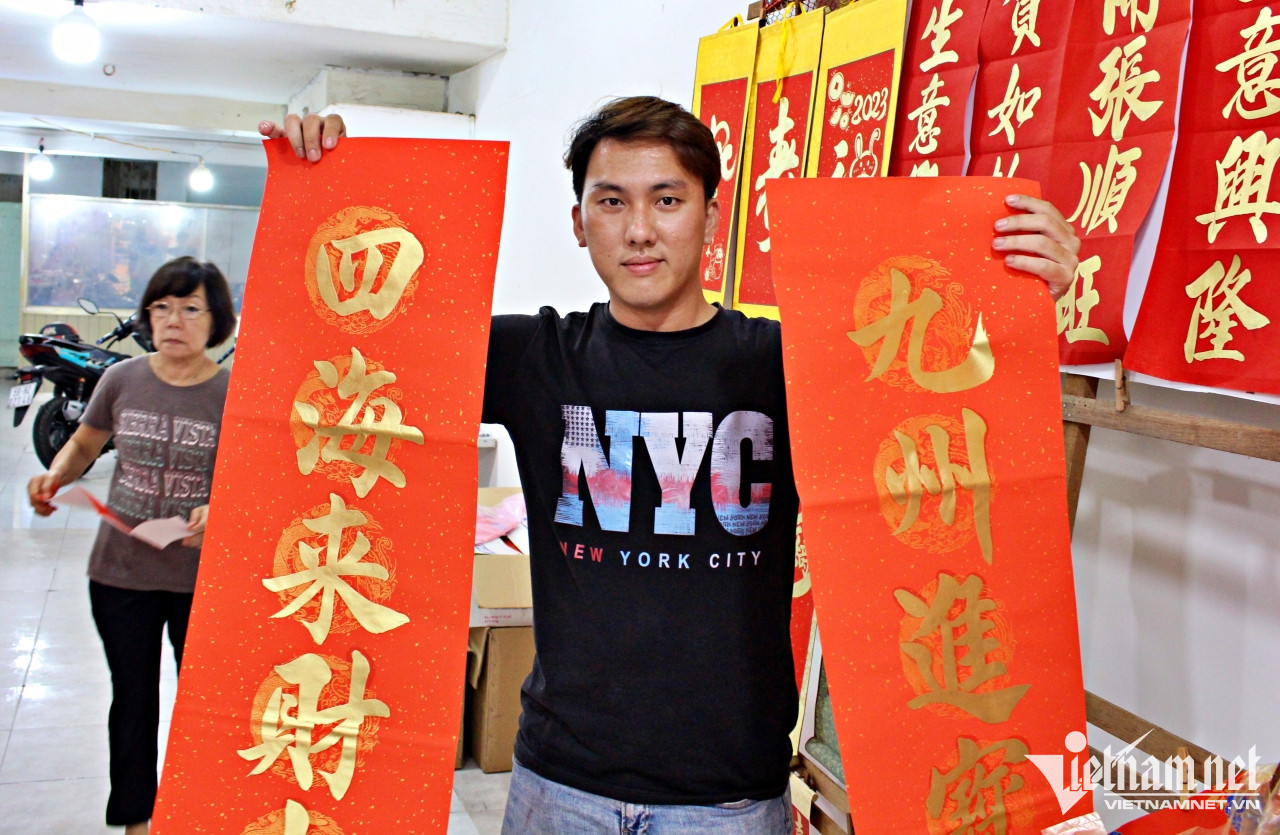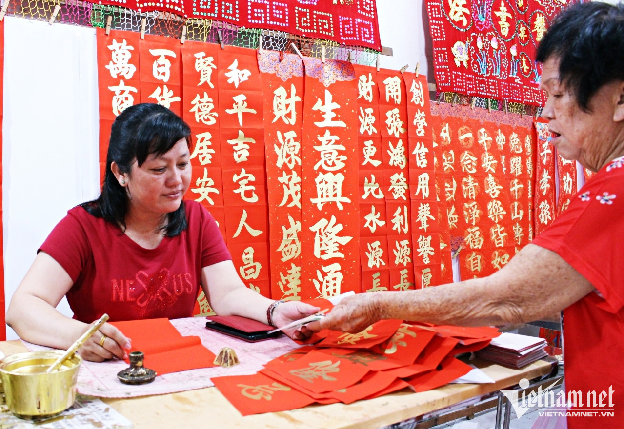 Là truyền nhân gia đình viết liễn Tết có tiếng của Sài Gòn xưa, chị Viên Dũ, Triều Minh có một lượng khách hàng đông đảo. Ngoài lượng khách đã đặt trước, cả hai còn trực tiếp viết cho khách đến cửa hàng xin chữ.