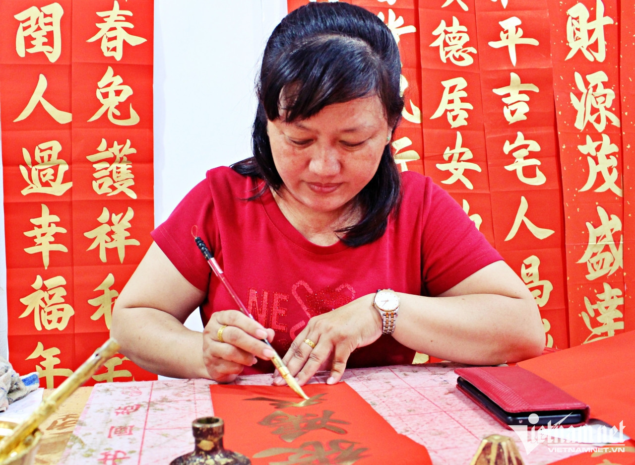 Đây là nghề tay trái của chị Viên Dũ. Thế nhưng chị đã có 20 năm kinh nghiệm và là thế hệ thứ ba của gia đình chuyên viết liễn, câu chúc may mắn ngày Tết.