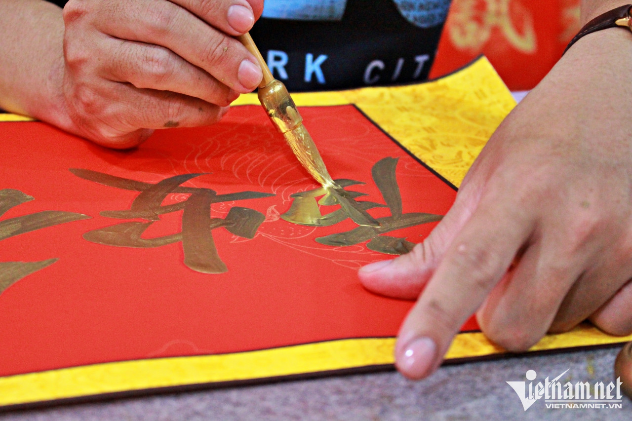 Bắt đầu từ 8h sáng, chị Lương Viên Dũ (43 tuổi, Quận 5, TP.HCM) cùng em trai Lương Triều Minh (33 tuổi) bày giấy đỏ, mực nhũ vàng để viết liễn Tết, câu chúc may mắn cho người cần. Cả hai ngồi trong gian phòng ngập tràn những bức liễn được viết bằng mực nhũ vàng trên nền giấy hồng điều đỏ rực.