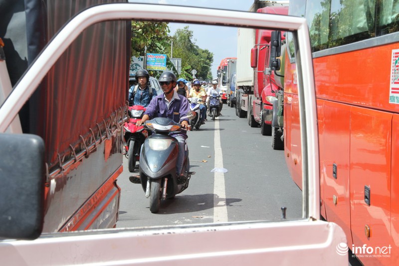 Những người đi xe máy luồn lách qua biển phương tiện |