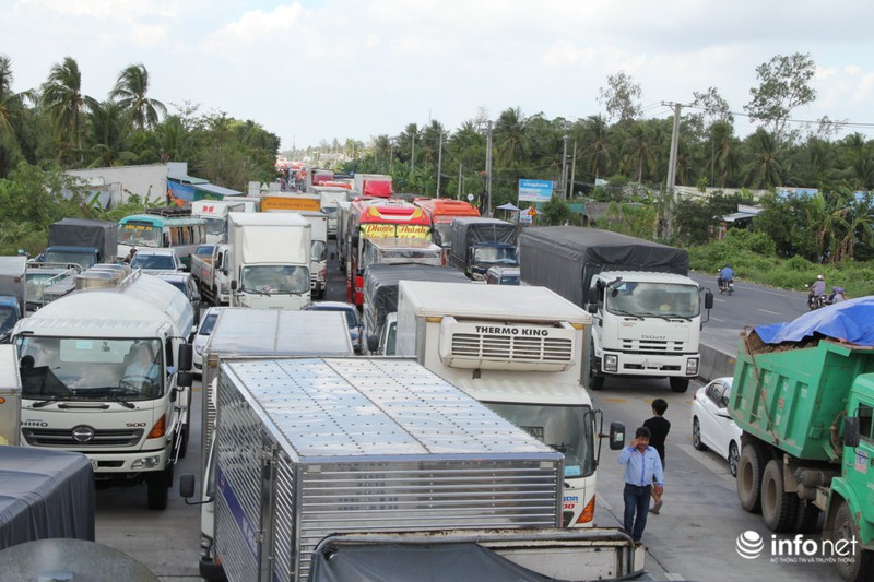 Các phương tiệngiao thông xếp hàng 5 giờ liền tại trạm thu phí BOT Sóc Trăng theo cả 2 hướng từ Hậu Giang đến Bạc Liệu và ngược lại |