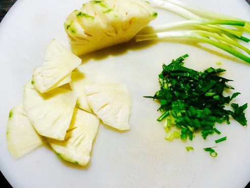 Bước 2: Cà chua cắt hạt lựu, sả, hành tím băm nhỏ. Dứa cắt miếng mỏng. Hành hoa, mùi tàu nhặt rửa sạch thái nhỏ, để lại phần cọng hành trắng không thái nhé.