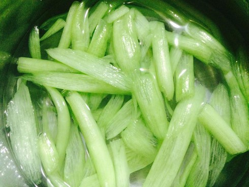 Bóp dọc mùng với muối hạt và dấm gạo cho xẹp xuống, rửa lại nhiều lần với nước cho hết vị mặn và vắt thật khô dọc mùng.