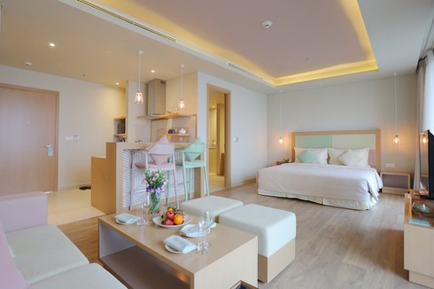 Ngoài khu villa hướng biển - nơi nghỉ dưỡng đầy lãng mạn của những đôi tình nhân, các phòng khách sạn cũng là lựa chọn tuyệt vời với thiết kế hiện đại và đầy đủ tiện nghi, nơi du khách có thể mở cửa hít thở không khí trong lành của biển cả bất cứ khi nào.