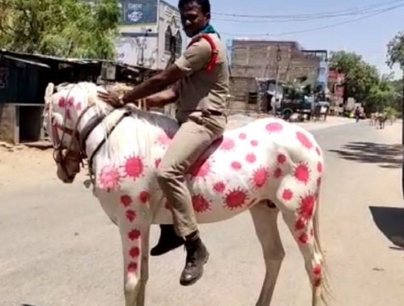 Mới đây, một cảnh sát ở bang Andhra Pradesh đã vẽ hình ảnh virus corona chủng mới (SARS-CoV-2) gây bệnh viêm đường hô hấp cấp lên người một con ngựa trắng và sau đó điều khiển chú ngựa đi qua cộng đồng dân cư.