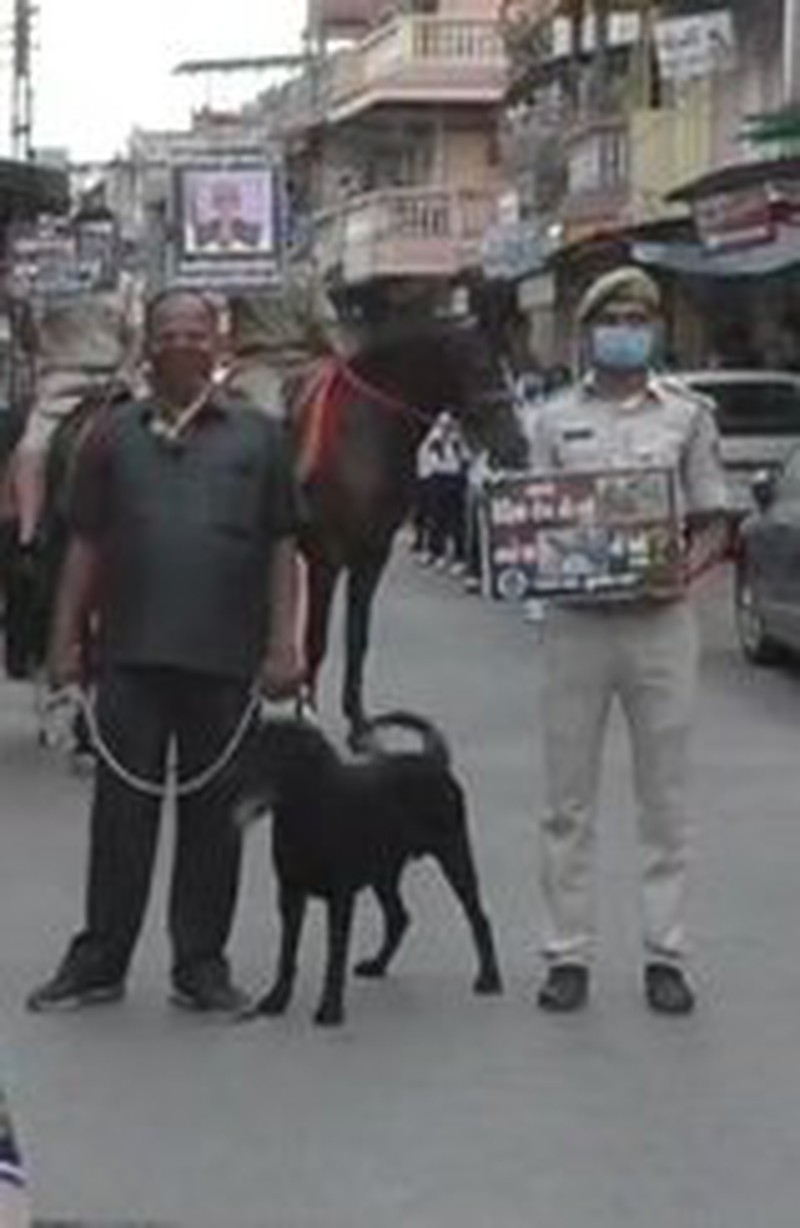 Cảnh sát Ấn Độ huy động cả chó và ngựa để tuyên truyền chống dịch Covid-19. (Ảnh: Twitter) |