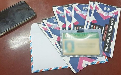 Trường hợp này bị bắt quả tang khi đang chào mời người hâm mộ mua 4 cặp vé mời trên khán đài A với giá 4,5 triệu đồng/cặp.