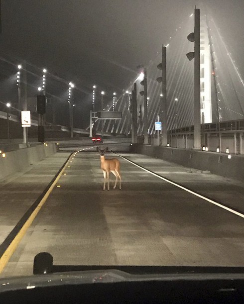Bức ảnh được lực lượng Tuần tra Cao tốc California đăng tải hôm 29/8 cho thấy một chú hươu đang đứng “hiên ngang” giữa cây cầu qua vịnh San Francisco-Oakland. Đây là cây cầu có thu phí bắc qua Vịnh San Francisco, nối 2 thành phố San Francisco và Oakland của Mỹ.