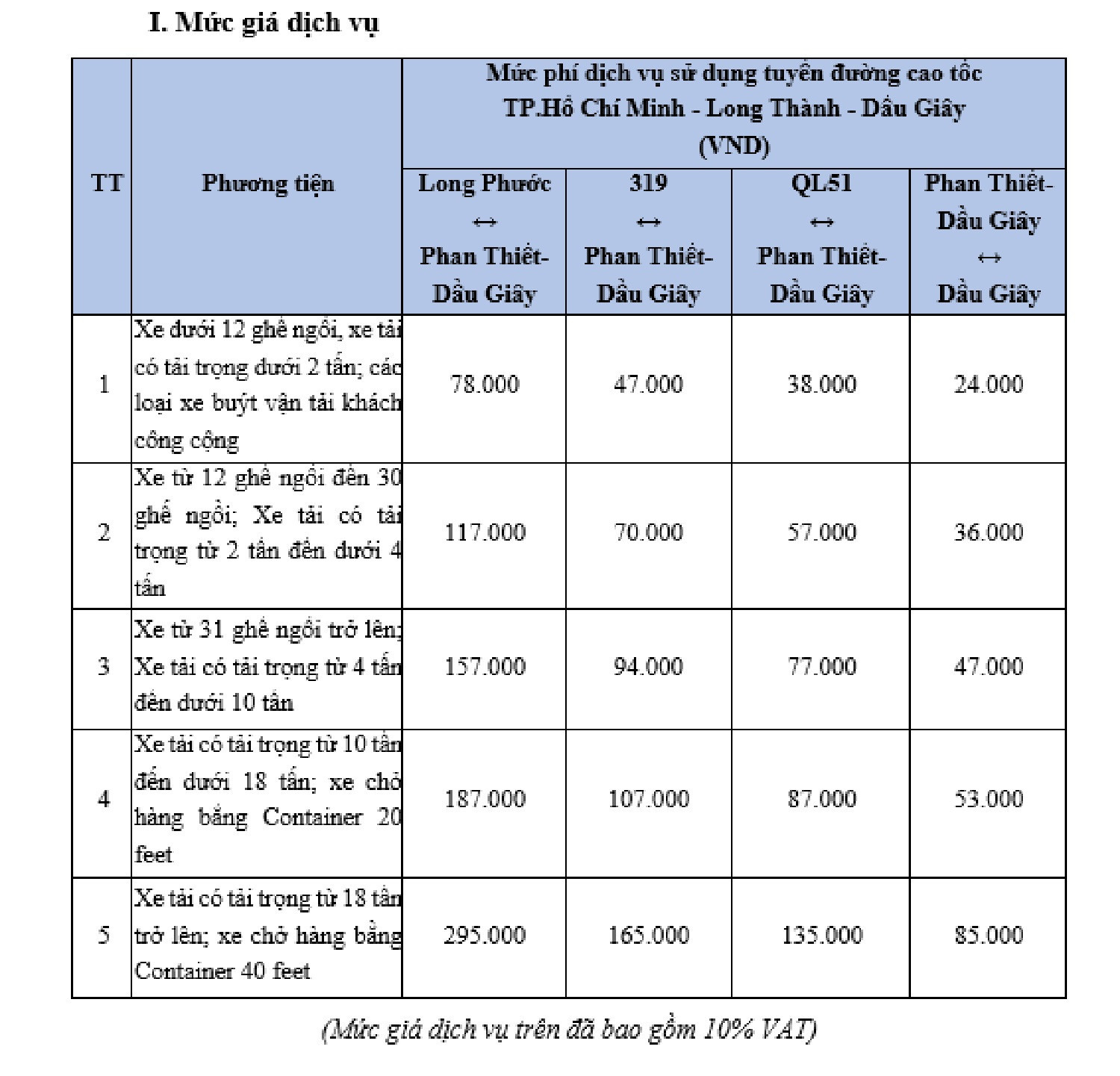 Ví dụ: Nếu đi từ Long Phước (TP Thủ Đức) đến hết cao tốc HLD là điểm giao quốc lộ 1A (huyện Thống Nhất, Đồng Nai) thì thu phí 98.000 đồng (chưa tính VAT). Tuy nhiên, nếu phương tiện đi từ Long Phước đến nút giao thành phần đầu tư xây dựng đoạn Phan Thiết - Dầu Giây, muốn thoát cao tốc HLD vào tuyến cao tốc Phan Thiết- Dầu Giây thì chi phí sẽ giảm xuống còn 78.000 đồng (chưa tính VAT).