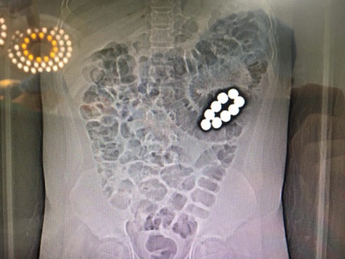 Trong khi tiến hành can thiệp mổ, bác sĩ phát hiện bệnh nhân bị tắc ruột do 9 viên bi nam châm bằng sắt nằm ở 2 khoang ruột khác nhau. Một khoang chứa 7 viên và khoang còn lại chứa 2 viên. Hai nhóm bi nam châm hút 2 đoạn ruột lại với nhau gây tắc ruột hoàn toàn và gây hoại tử ruột.