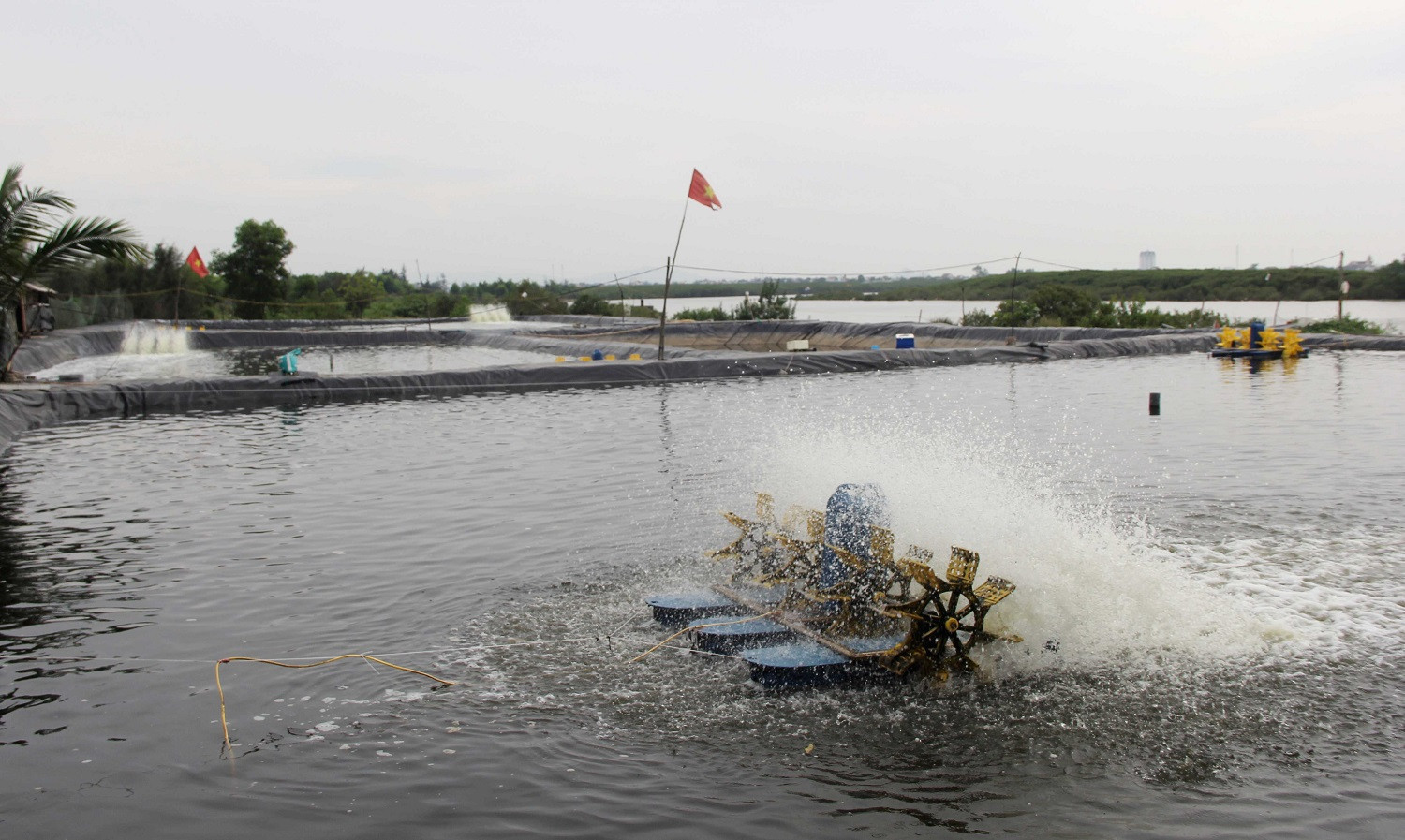 Trang trại nuôi tôm luôn phải duy trì máy sục ô xy để tôm sinh trưởng. Ảnh: Việt HòaÔng Sơn chuẩn bị sẵn máy phát điện cỡ lớn ở hồ nuôi tôm, phòng khi bị cắt điện đột ngột. Ảnh: Việt Hòa