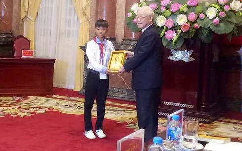 Theo đó, em Võ Hồng Hiếu (học sinh lớp 6H, Trường THCS Bình An Thịnh, huyện Lộc Hà, Hà Tĩnh) vừa vinh dự cùng hơn 50 học sinh, sinh viên trên cả nước được Tổng Bí thư - Chủ tịch nước Nguyễn Phú Trọng gặp mặt và tặng ảnh Bác Hồ.