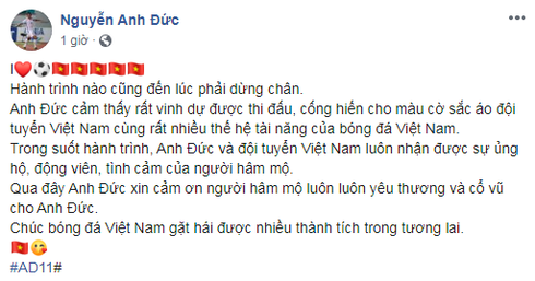 Trên trang Facebook của mình, mới đây nam cầu thủ kì cựu Nguyễn Anh Đức đã chia sẻ bài đăng nói về việc rời đội tuyển bóng đá quốc gia Việt Nam. Anh chia sẻ hành trình nào rồi cũng có lúc dừng chân, bản thân Anh Đức cảm thấy rất vinh dự khi được thi đấu và cống hiến cho màu cờ sắc áo của đội tuyển cũng như các thế hệ tài năng của bóng đá Việt. Nam cầu thủ gửi lời cảm ơn đến người hâm mộ đã luôn yêu thương và ủng hộ mình trong thời gian vừa qua.