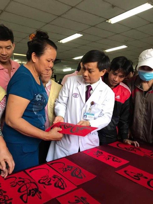 Đặc biệt, nhằm giúp người bệnh có thêm niềm tin yêu cuộc sống, một “phố ông đồ” đơn giản đã được hình thành ngay trong sân bệnh viện. Những chữ “Tâm”, “Nhân”, “Phúc”… được viết thư pháp bằng mực đen trên giấy đỏ đã góp thêm một phần không khí xuân cho những người bệnh.