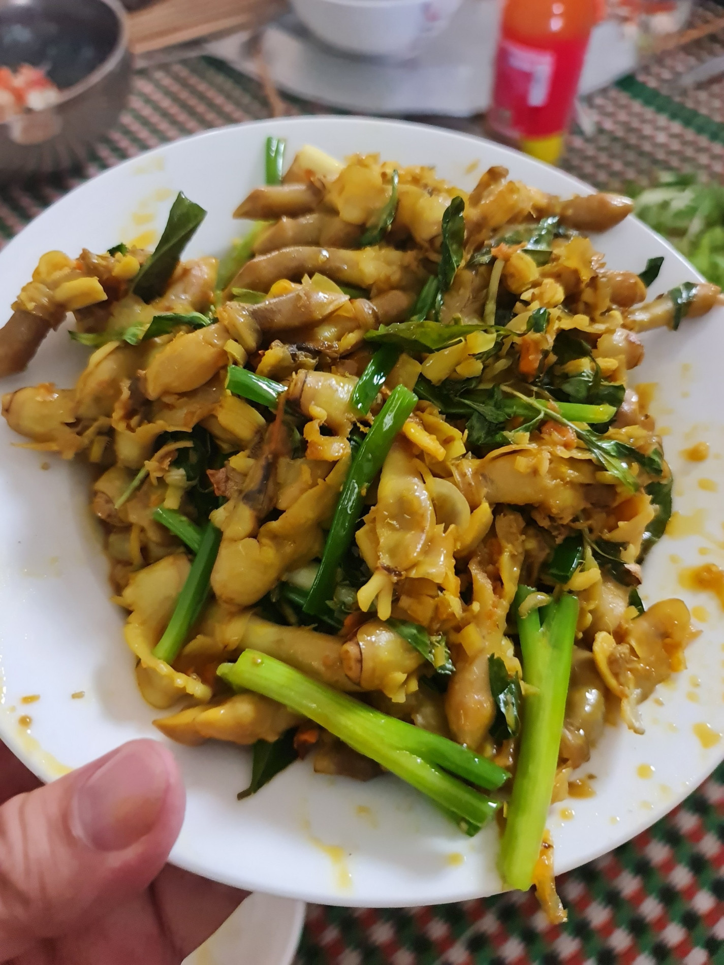 Tôi dùng mỡ lợn xào măng đã luộc kèm mấy quả ớt. Bắc một cái chảo khác phi hành tỏi, sả cho thơm rồi cho ếch đã rán vàng, măng xào vào trộn cho ngấm gia vị.