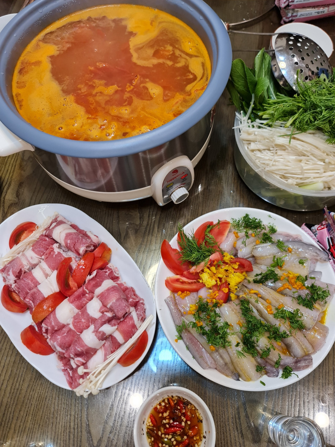 Nước lẩu hầm xương, dùng cà chua làm màu, cho ít mẻ hoặc dấm bỗng cho dậy mùi. Tôi ra vườn hái xà lách, kinh giới, tía tô, hoa chuối…để nhúng lẩu.