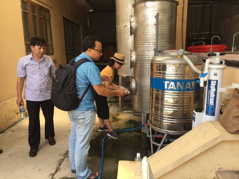 TS Hải kiểm tra hệ thống lọc asen tại Trường Mầm non Hoàng Tây, huyện Kim Bảng, tỉnh Hà Nam. |
