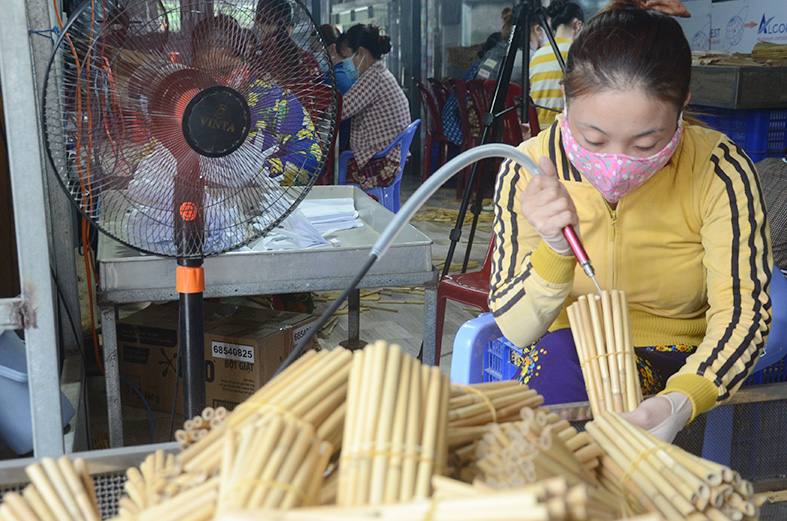 Người lao động tại xưởng sản xuất ống hút của Huỳnh Văn No gia công sản phẩm ống hút từ sậy, cỏ bàng.