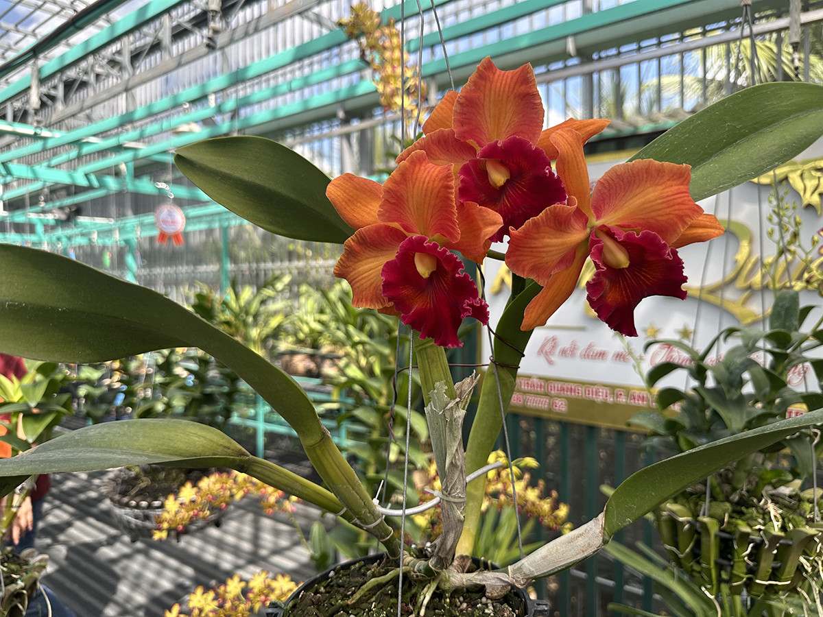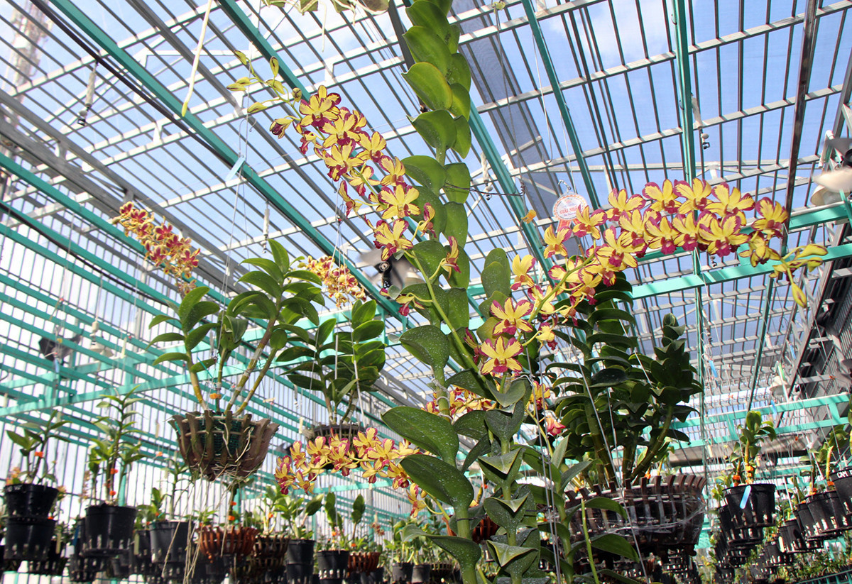 Vườn lan của anh Quyền được xây dựng kiên cố trên mái nhà rộng 500m2. Trên vườn có quạt thông gió chạy ù ù. Bên trong, các chậu lan xếp thành từng hàng, mỗi chậu được đánh dấu, ghi các tên như: thiên long, lửa rồng, cam lửa…