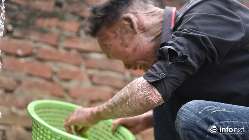 Thọ chia sẻ, dù là mùa đông hay mùa hè thì thời tiết cũng là điều khiến anh chàng phải lo sợ. Do da không có tuyến mồ hôi để tự bài tiết, nên mùa hè Thọ phải vùi mình trong nước lạnh, 50 – 60 lần mỗi ngày. Còn mùa đông các vết nứt toạc máu, da bỏng rát vô cùng khiến anh chàng đau đớn, khổ sở |