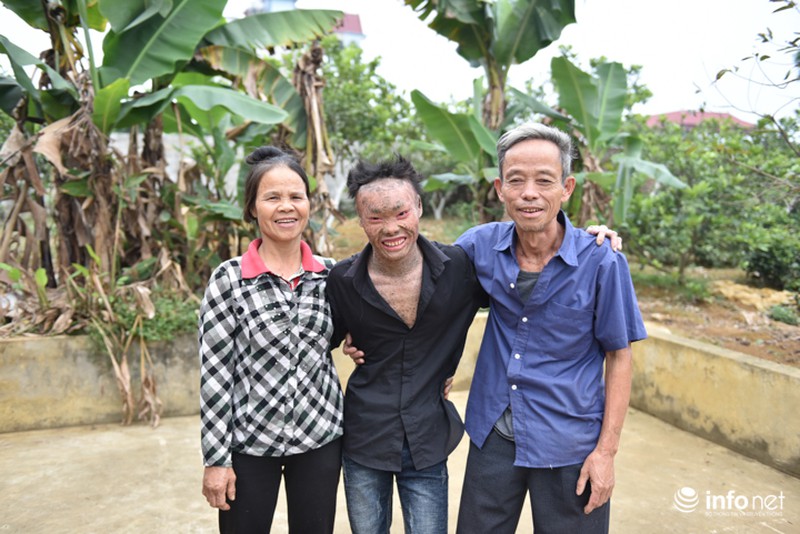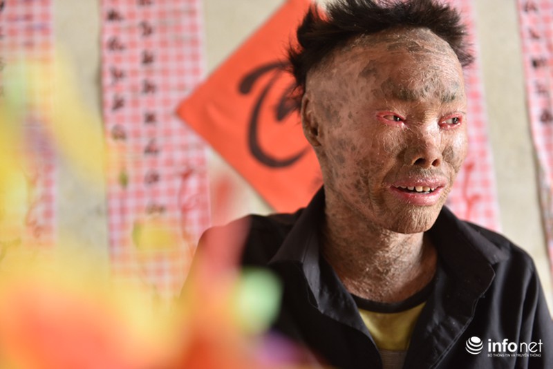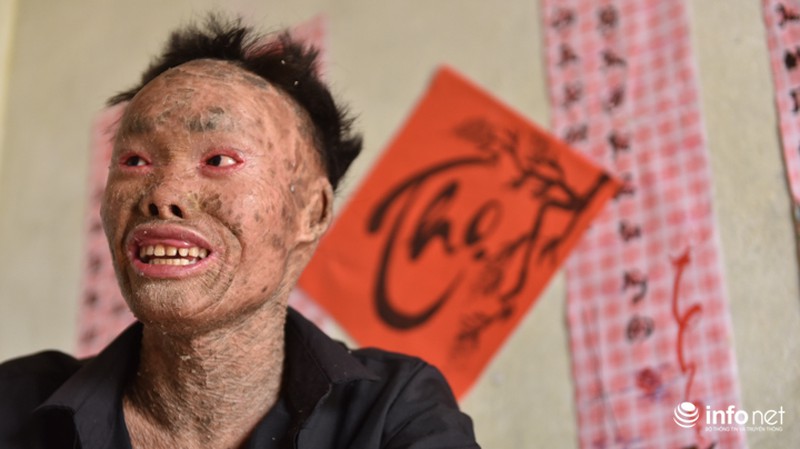 Chia sẻ về căn bệnh của con trai, bà Cúc, mẹ của Thọ cho biết: "Khi sinh Thọ ra, nó vẫn bình thường như bao đứa trẻ khác, nhưng khoảng một tiếng sau thì da nó đen sì, bong tróc, khô ráp. Bác sĩ bảo bệnh của cháu là bệnh hoại tử da hay còn gọi là da cá, da rắn.Tôi và chồng đã chạy chữa cho cháu rất nhiều nhưng không khỏi" |