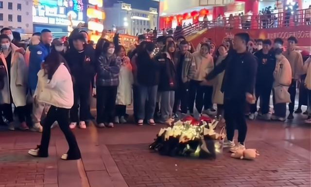 Ngay trên con phố đông đúc, người này chuẩn bị hoa, đèn lồng, trên tay ôm một con thú bông. Sau đó, anh quỳ gối và cầu hôn bạn gái ở khu trung tâm, trước sự chứng kiến của nhiều người qua đường.