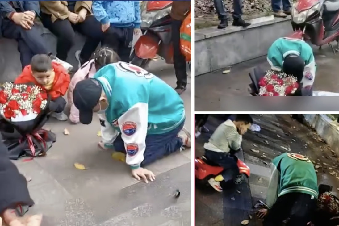 Lúc đầu, không ai thực sự để ý đến nam thanh niên đơn độc đang quỳ trên đường với bó hoa hồng đỏ thắm bên cạnh. Tuy nhiên, nhiều giờ trôi qua, mọi người bắt đầu chú ý và hỏi anh ta đang làm gì. Không lâu sau, một đám đông tò mò đã vây kín xung quanh.