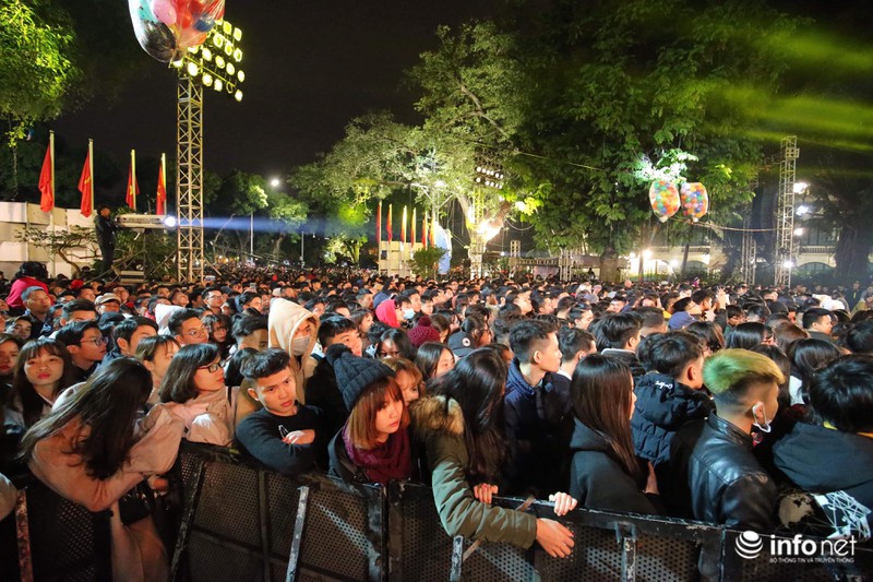 Từ khoảng 21h ngày 31/12, sân khấu countdown dưới chân Tượng đài Lý Thái Tổ đã đông cứng người. Mặc dù năm nay Hà Nội không bắn pháo hoa nhưng khu phố đi bộ quanh Hồ Gươm luôn thu hút được người dân vào mỗi dịp lễ, Tết.
