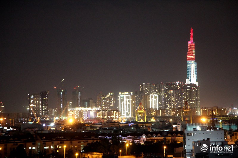 Tại TP.HCM, đỉnh tòa tháp Landmark 81 được phủ quốc kỳ khổng lồ bằng đèn led trong đêm 31/12. Các tòa nhà quanh đây cũng bật đèn sáng rực.