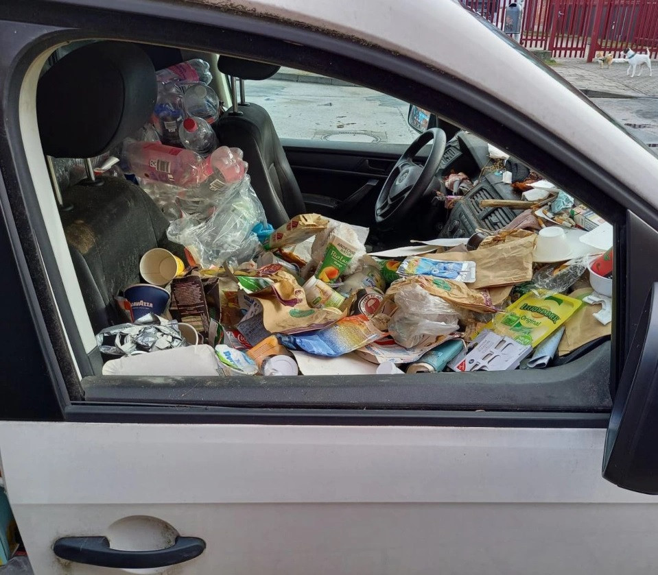 Rác bên trong xe nhiều đến mức tưởng chừng chỉ cần hạ kính xe xuống là có thể bị rơi ra ngoài. Chỉ còn duy nhất khu vực ghế lái là còn trống và không bị rác “tấn công”.