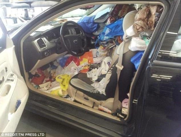 Thậm chí, số rác bên trong xe đã chất đầy thành đống cao ngang vai người lái và tràn lan ra khắp bảng điều khiển của xe. Hàng ghế sau của xe cũng không sạch sẽ hơn là mấy khi cũng bị chất đầy rác và chai nước uống dở.