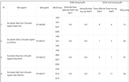 Theo đó, trường Cao đẳng Sư phạm Gia Lai thông báo điểm trúng tuyển xét theo kết quả kỳ thi THPT quốc gia là 9 điểm (3 môn thi) với các ngành sư phạm cơ bản là: Toán, Vật lý, Ngữ văn, Lịch sử, Tiếng Anh.